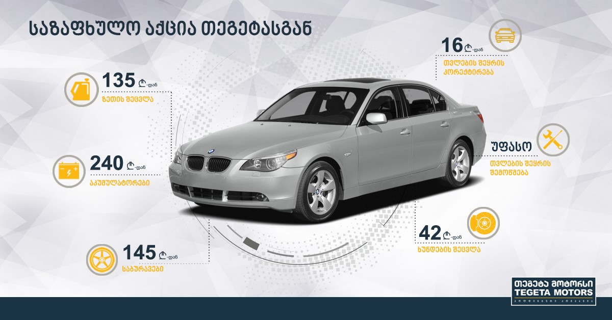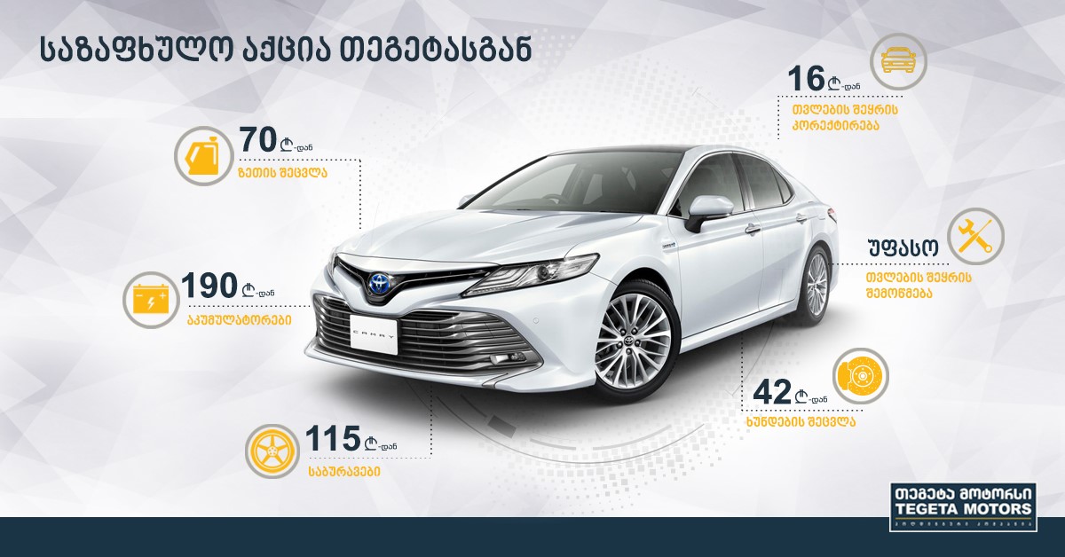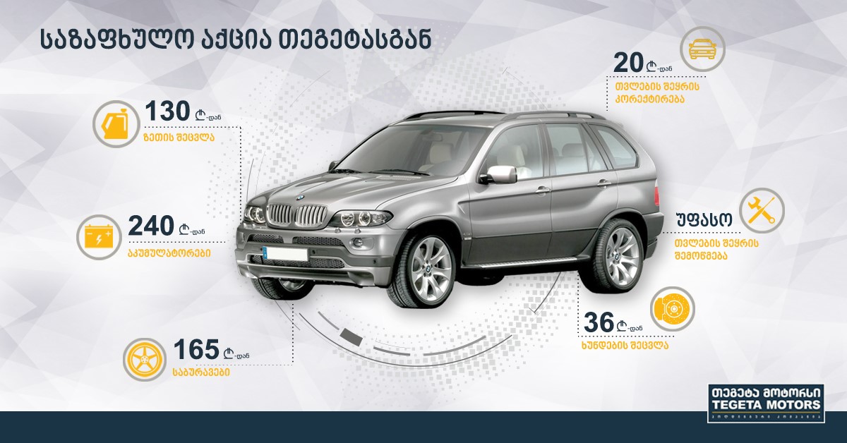 თუ გყავს Toyota Prius ან Toyota Camry, BMW X5 ან BMW E60, Mercedes-Benz 211 ან Hyundai Sonata მაშინ ეს აქცია შენთვისაა.